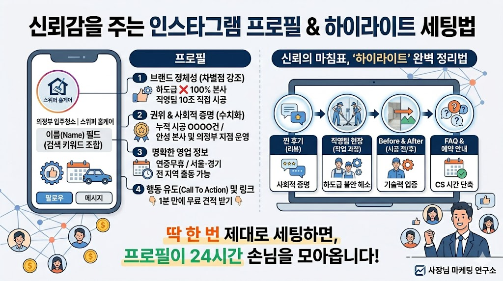 아무리 훌륭한 100% 직영팀의 기술력을 갖추고 있어도, 온라인 간판이 지저분하면 고객은 문을 열고 들어오지 않습니다. 오늘 알려드린 공식대로 지금 당장 스마트폰을 켜고 프로필 텍스트와 하이라이트를 정돈해 보세요. 고객의 문의 전화 횟수가 달라지는 것을 체감하실 수 있을 것입니다.